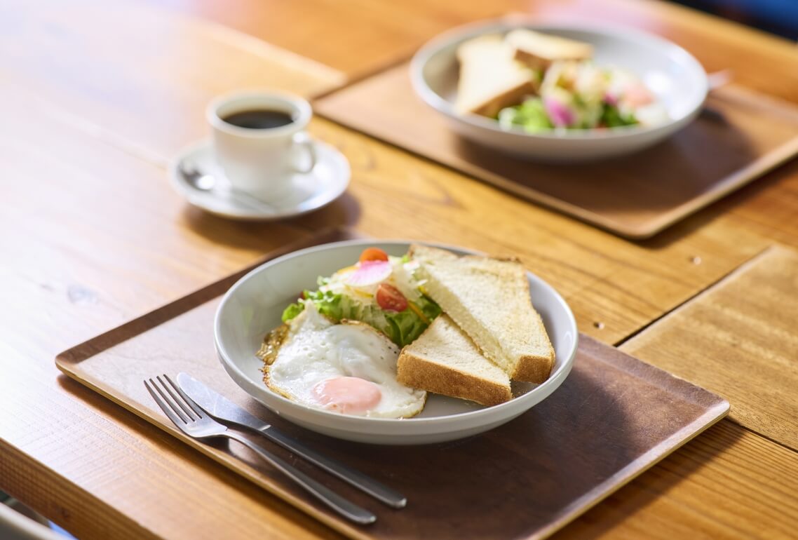 洋食:地元パン屋さんの焼きたてトーストとコーヒー、サラダ、